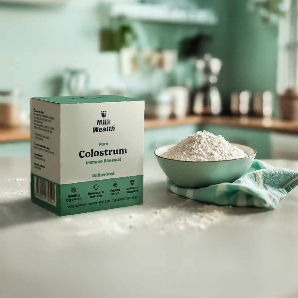 Milk Wealth Bovine Colostrum is a natural superfood packed with immunoglobulins (IgG, IgA, IgM) and lactoferrin and provides strong immune support. It helps protect against seasonal illnesses and allergies while maintaining overall immune balance. Whether you're curious about what bovine colostrum does or how it strengthens the body, its benefits for both adults and kids are undeniable.